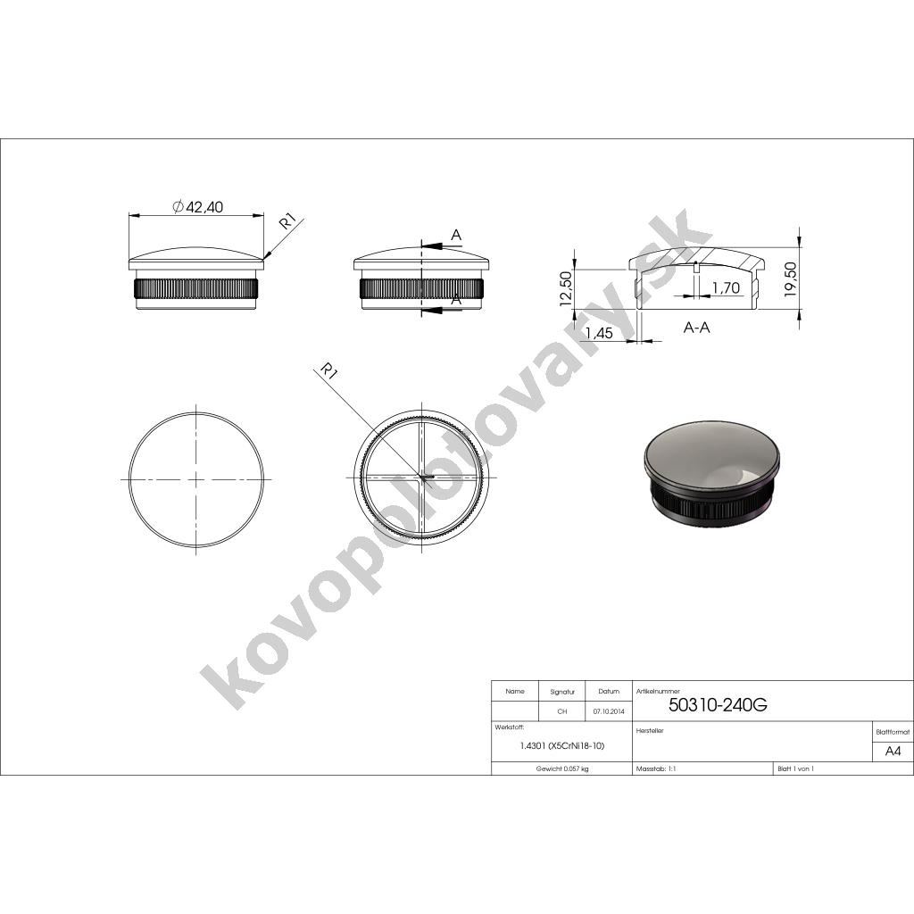 Nerezové ukončenie madla zábradlia pr.42,4 mm 50310-240G mierne vypuklé, AISI 304 brus