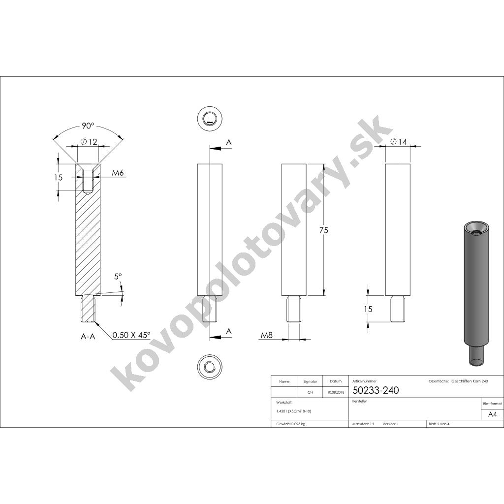 Materiál: ocel nerezová; Povrchová úprava: mat / brus K240; Pro průměr / průřez: 42,4; Třída oceli: AISI 304 (A2); Tvar profilu: O; Vlastnosti: ploché; pro nerez; závit;