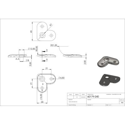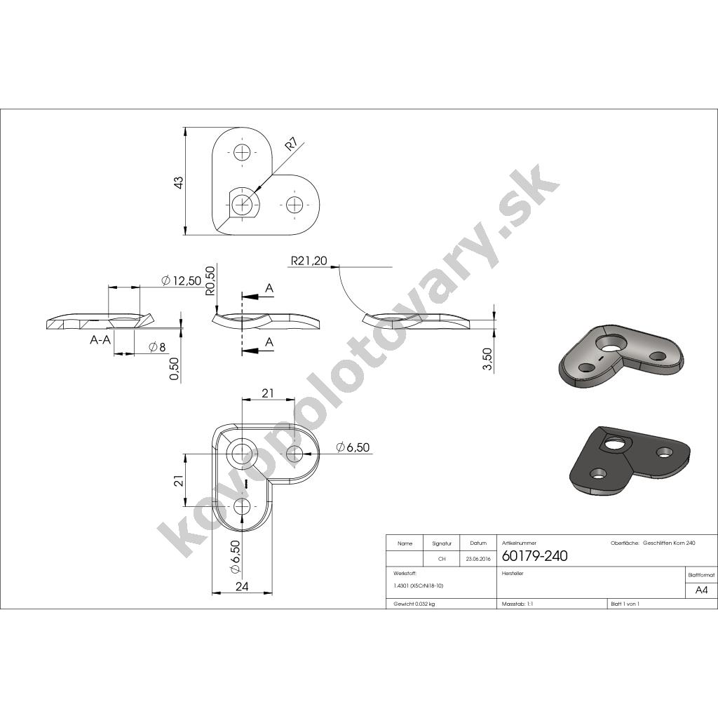 Materiál: ocel nerezová; Povrchová úprava: mat / brus K240; Pro typ madla: pr. 42,4 mm; Třída oceli: AISI 304 (A2); Uchycení: pro závit M6; Vlastnosti: flexi; rohové;