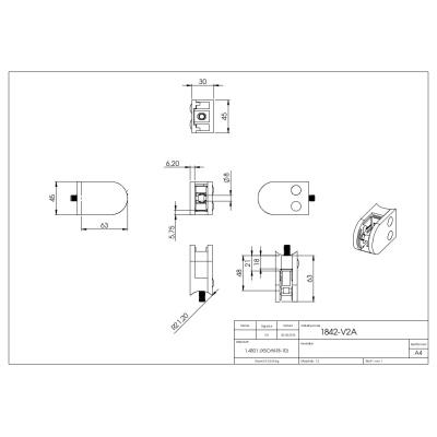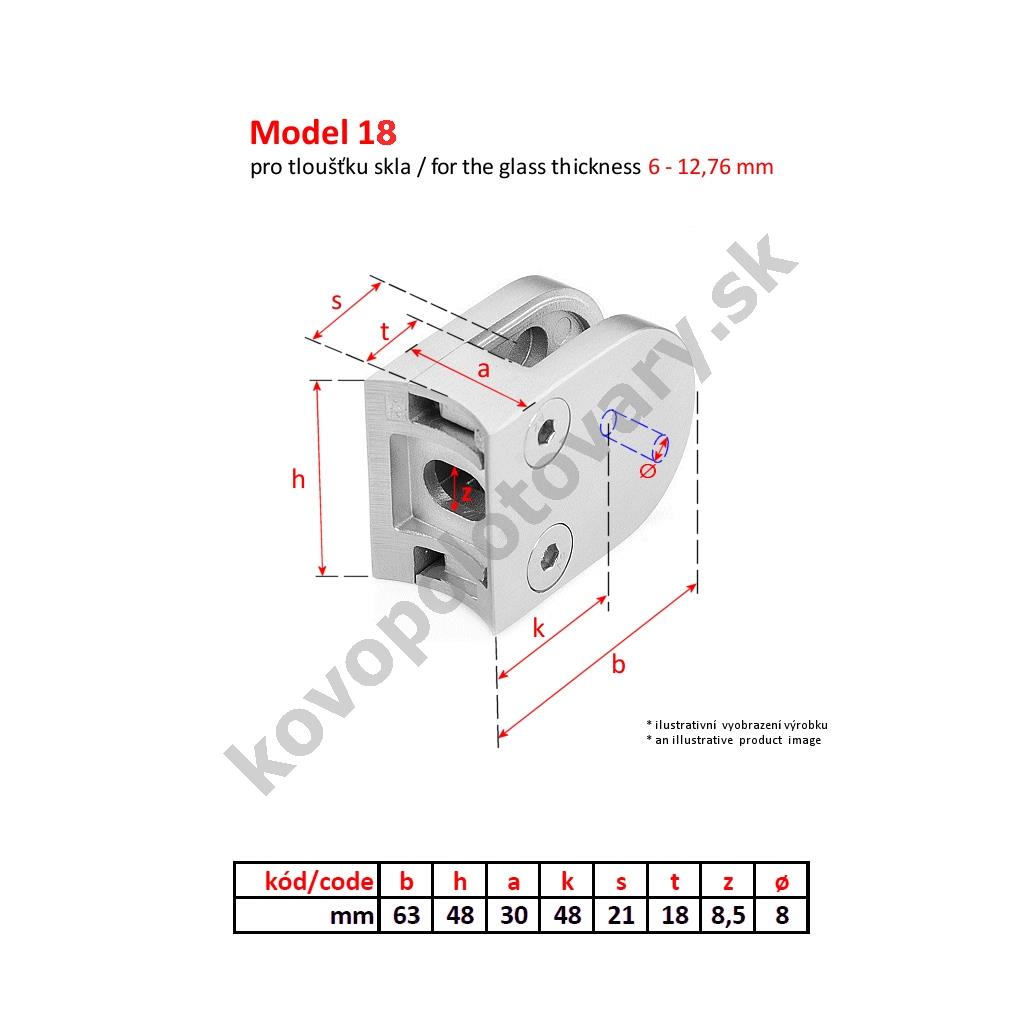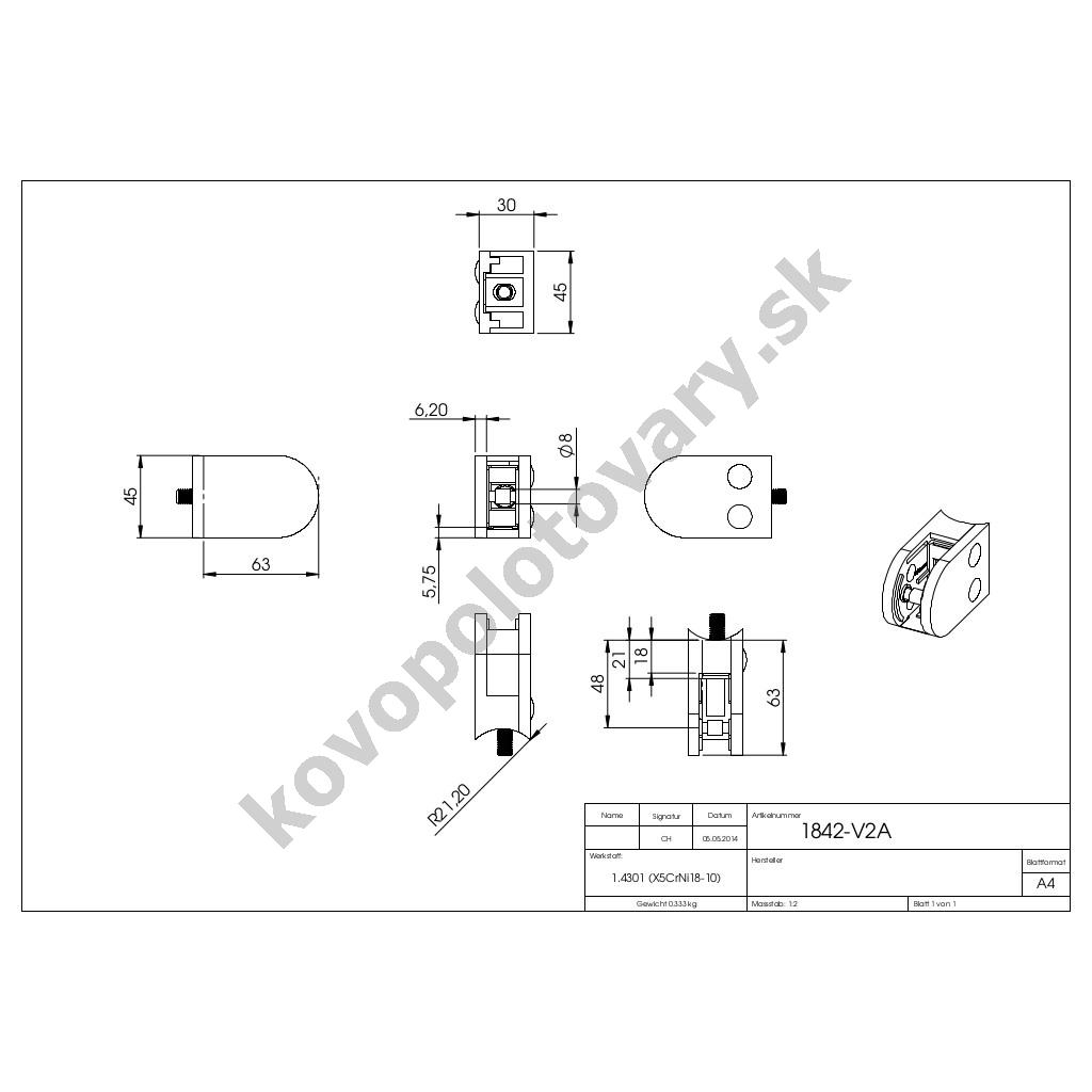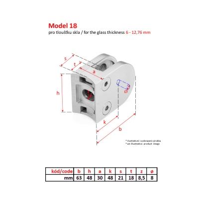 Hloubka: 30; Materiál: ocel nerezová; Model: 38; Povrchová úprava: mat / brus K240; Pro tloušťku výplně: 1,5; 10; 10,76; 11,52; 12; 12,76; 2; 3; 4; 6; 6,76; 8; 8,76; 9,52; Šířka: 63; Třída oceli: AISI 304 (A2); Tvar držáku: oblý; Typ závitu: M8; Uchycení: na trubku pr. 42,4 mm; Výška: 45; Zajišťovací čep: volitelné; Zajišťovací podpěra: volitelné;
