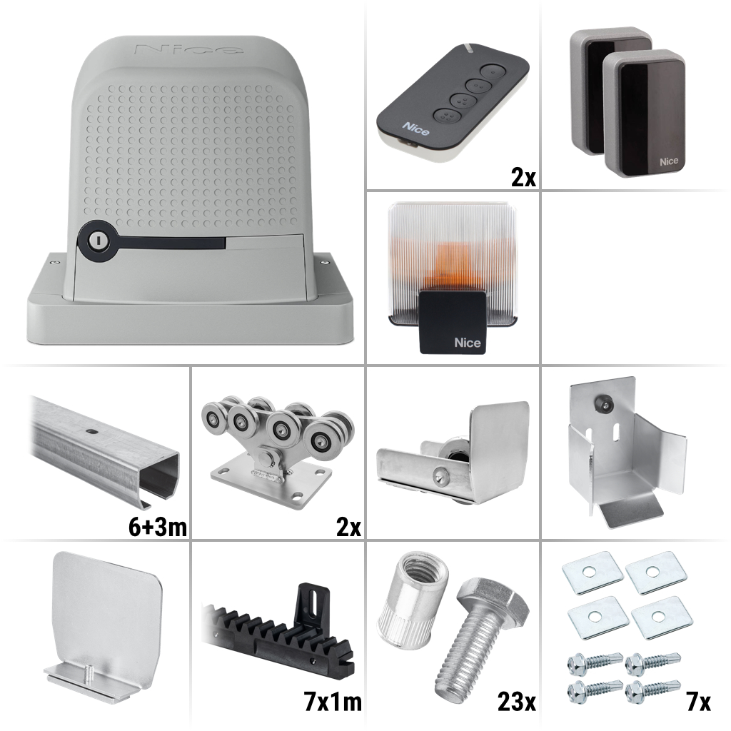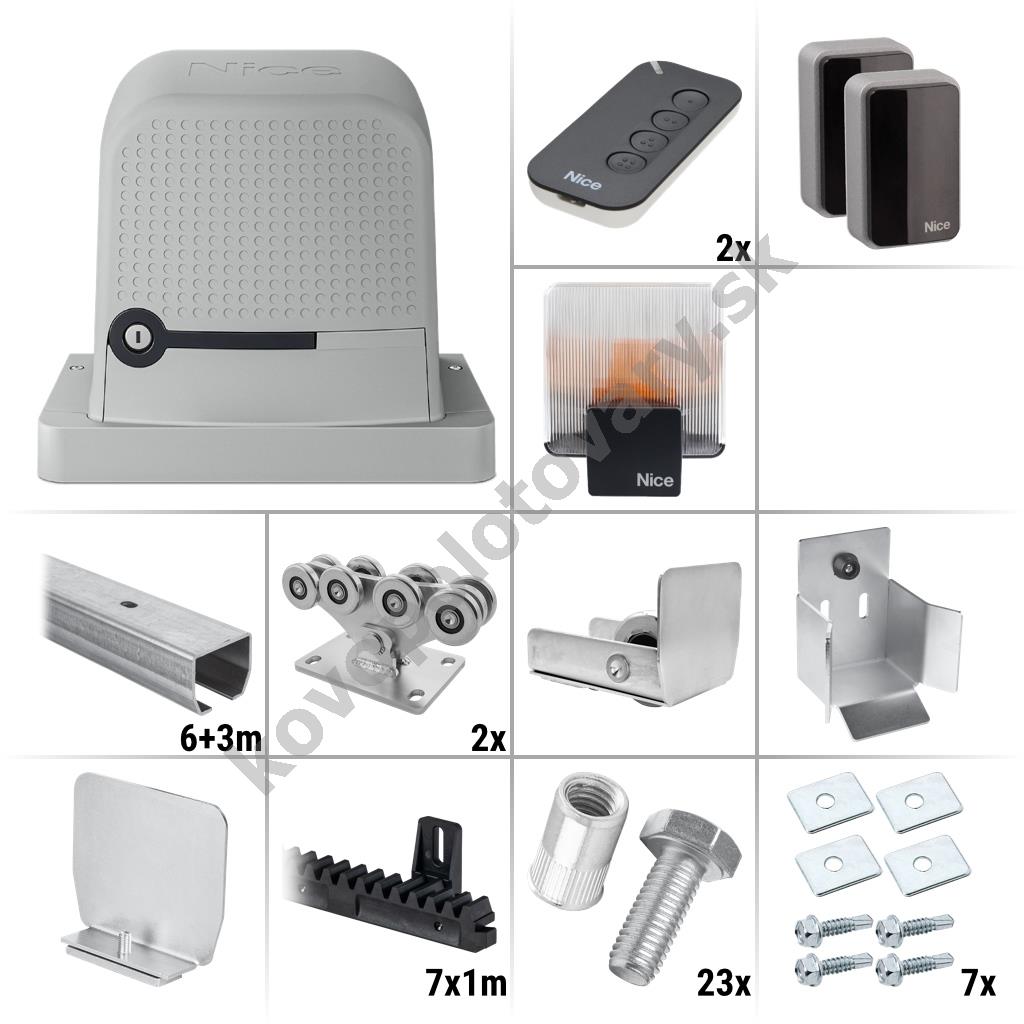 Nice Robus 600 BD KCE 9.1Z Zostava pojazdových komponentov, pohonu a príslušenstva na výrobu pojazdu a automatizáciu posuvnej samonosnej (nesenej) brány do 6,4 m prejazdnej šírky a celkovej hmotnosti do 600 kg.