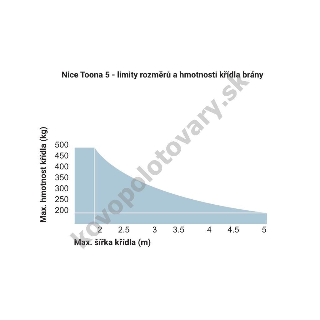 Nice Toona 5024 KCE Zostava lineárnych pohonov a príslušenstva pre automatizáciu privátnej aj priemyselnej dvojkrídlovej brány s hmotnosťou do 1000 kg a šírkou prejazdu do 10 m. Motor Nice Toona-5024 je vhodný pre automatizáciu krídlových brán s hmotnosťou jedného krídla do 500 kg a šírkou jedného krídla do 5 m. Bližšie špecifikácie, limity použitie a správne rozmery pre umiestnenie pohonov nájdete v návode a na doplňujúcich obrázkoch.