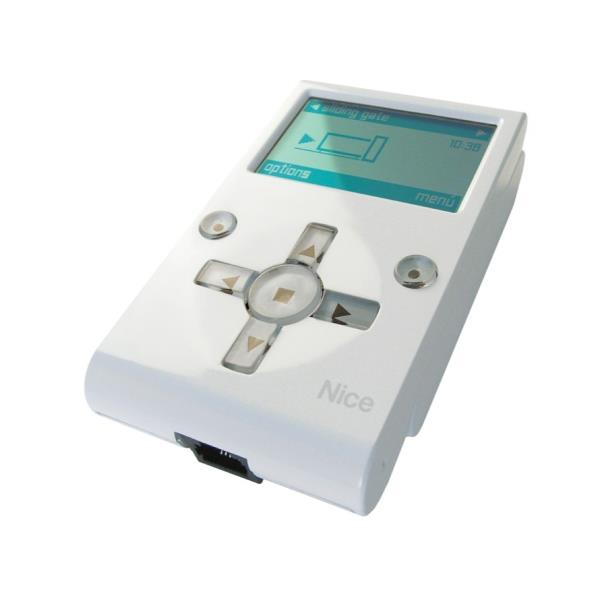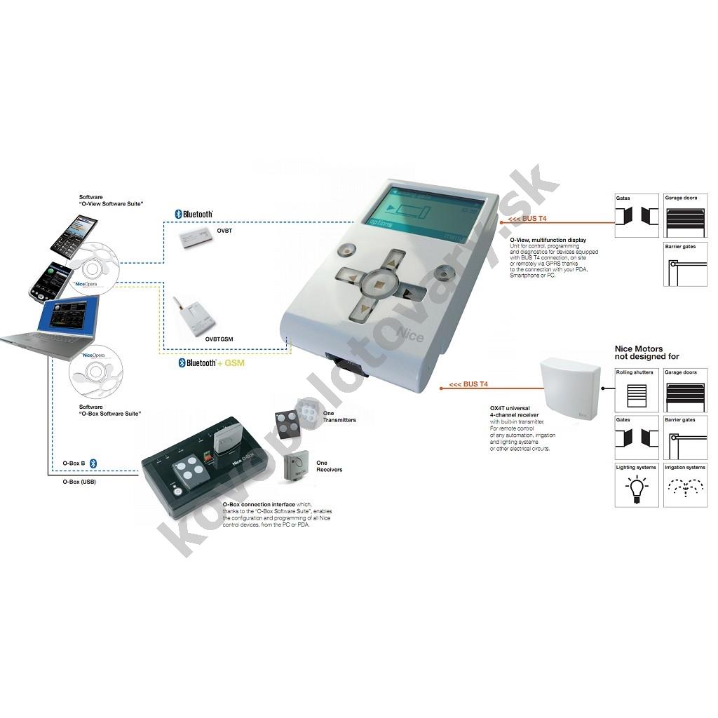 NICE O-VIEW Multifunkčný programátor s displejom umožňuje jednoduché naprogramovanie či diagnostiku porúch u rôznych pohonov kompatibilných so systémom Nice Opera - pohony brán, garážových brán a závor Nice (napr. Séria Walky, Run, Toona, Metro, X-Metro, HYPPO, Spin, Ten, Soon , X-Bar, Pop, Robus).