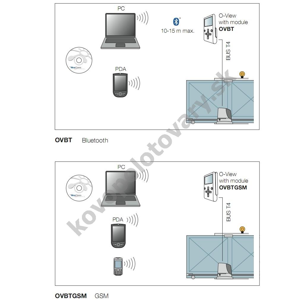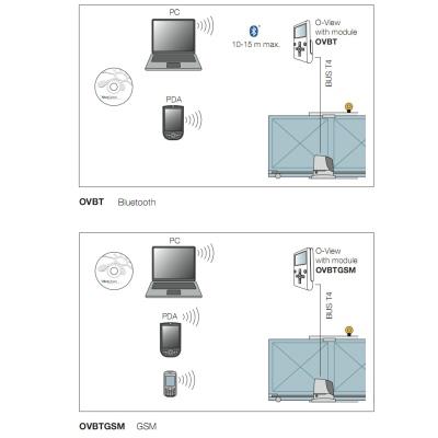 - vzdialene bezdrôtovo pomocou GSM / GPRS, napr. z PDA, smartphonu či PC. Je však potrebné dokúpiť modul OVBTGSM, vložiť ho do programátora O-View a ten je stále potrebné zapojiť na pohon cez kábel Bus T4.