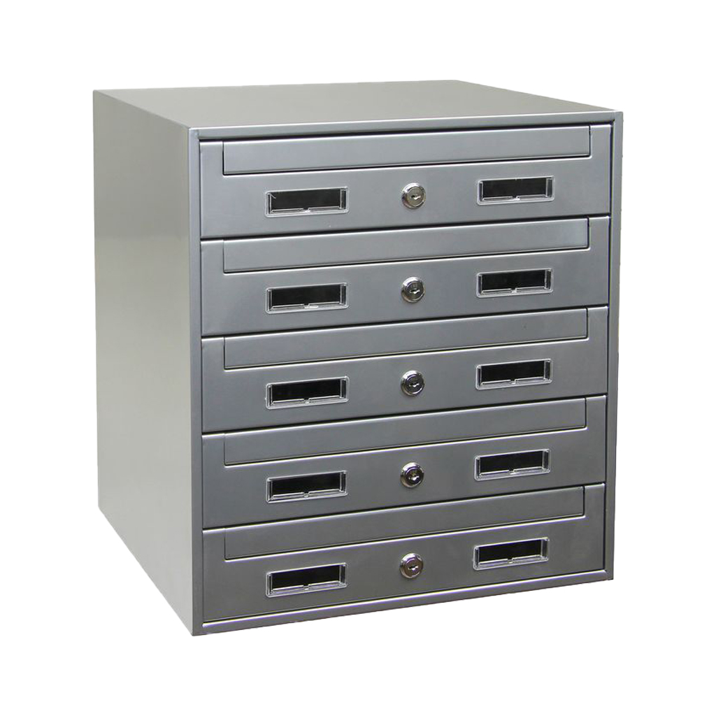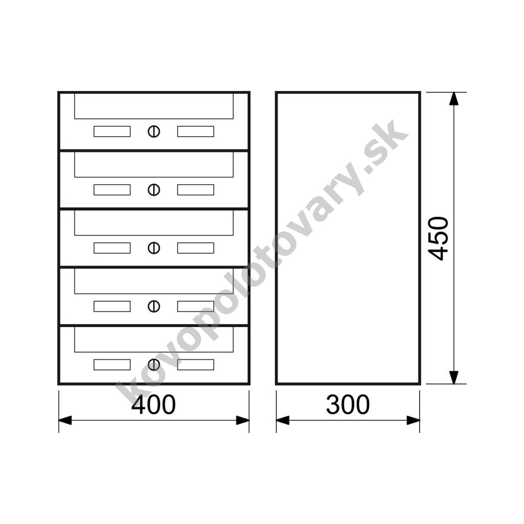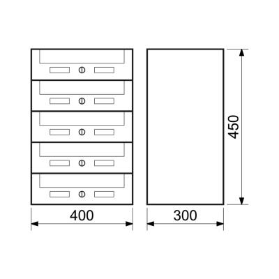 Barva schránky: Stříbrná RAL 9006; Hloubka schránky: 300; Jmenovka: Ano; Kamera: Ne; Komunikátor: Ne; Materiál: ocel; Montáž: na stěnu; Počet schránek v sestavě: 5; Povrchová úprava: barveno; pozinkováno; Šířka schránky: 400; Venkovní použití: Ano; Vhoz zásilek: vpředu; Výběr zásilek: vpředu; Výrobce: Richter Czech; Výška schránky: 450; Zvonkové tlačítko: Ne;