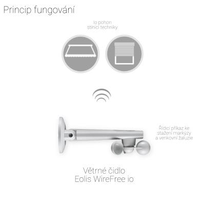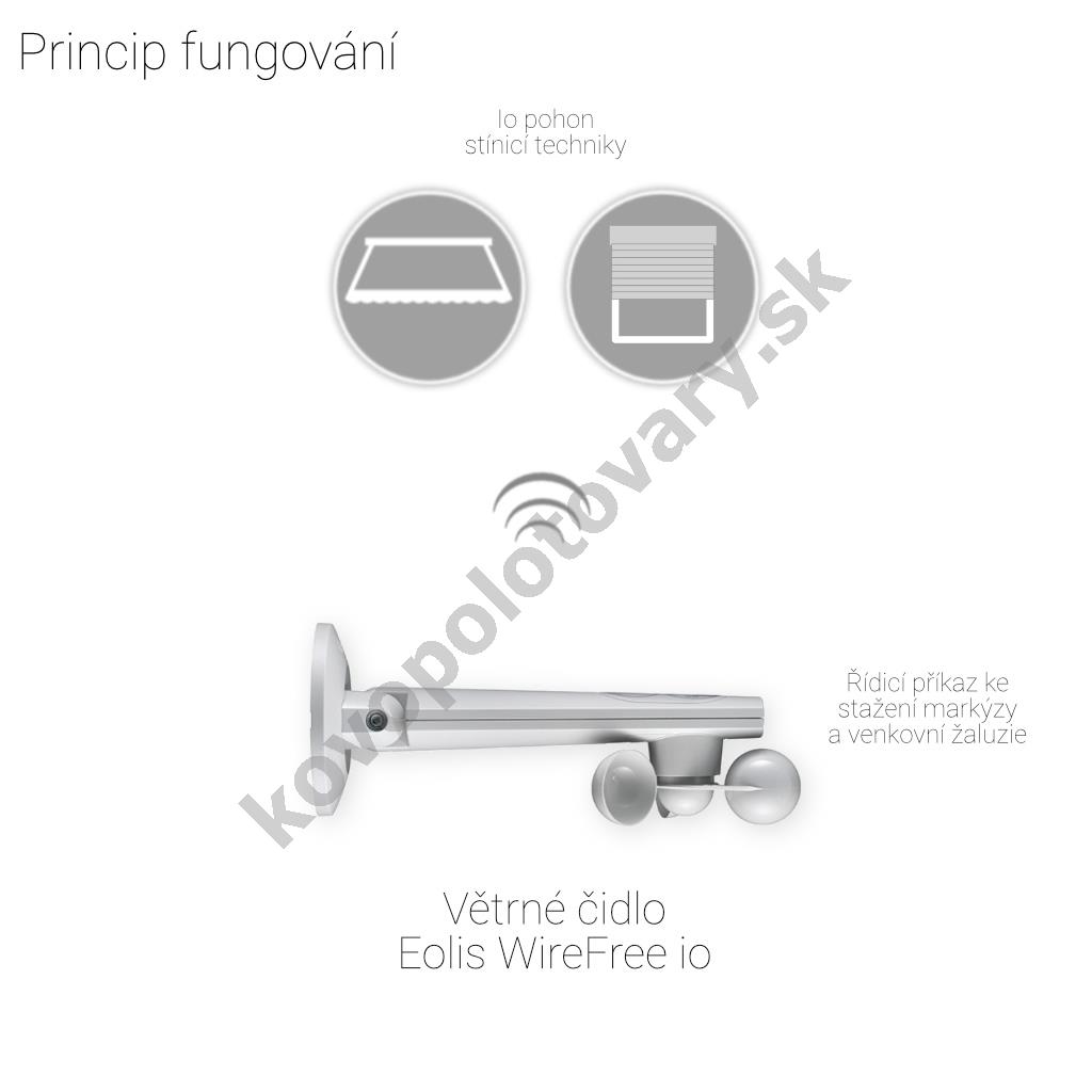 Spoľahlivá ochrana vonkajšej tieniacej techniky proti vetru. Pri nebezpečnom poryve vetra sa markíza s io pohonom automaticky stiahne. Vhodné tiež k automatickému sklápanie lamiel vonkajších žalúzií. Po skončení poryve vetra je čidlom blokovaná slnečná automatika po dobu 12 minút. Nie je kompatibilné s pohonmi RS100 io, Altus RS io a Oximo io. Snímač sa spája priamo s pohonom markízy alebo vonkajšej žalúzie, nie je možné ho pripojiť do centrálnej jednotky inteligentnej domácnosti.