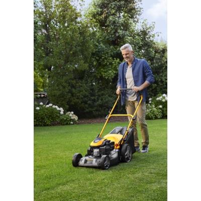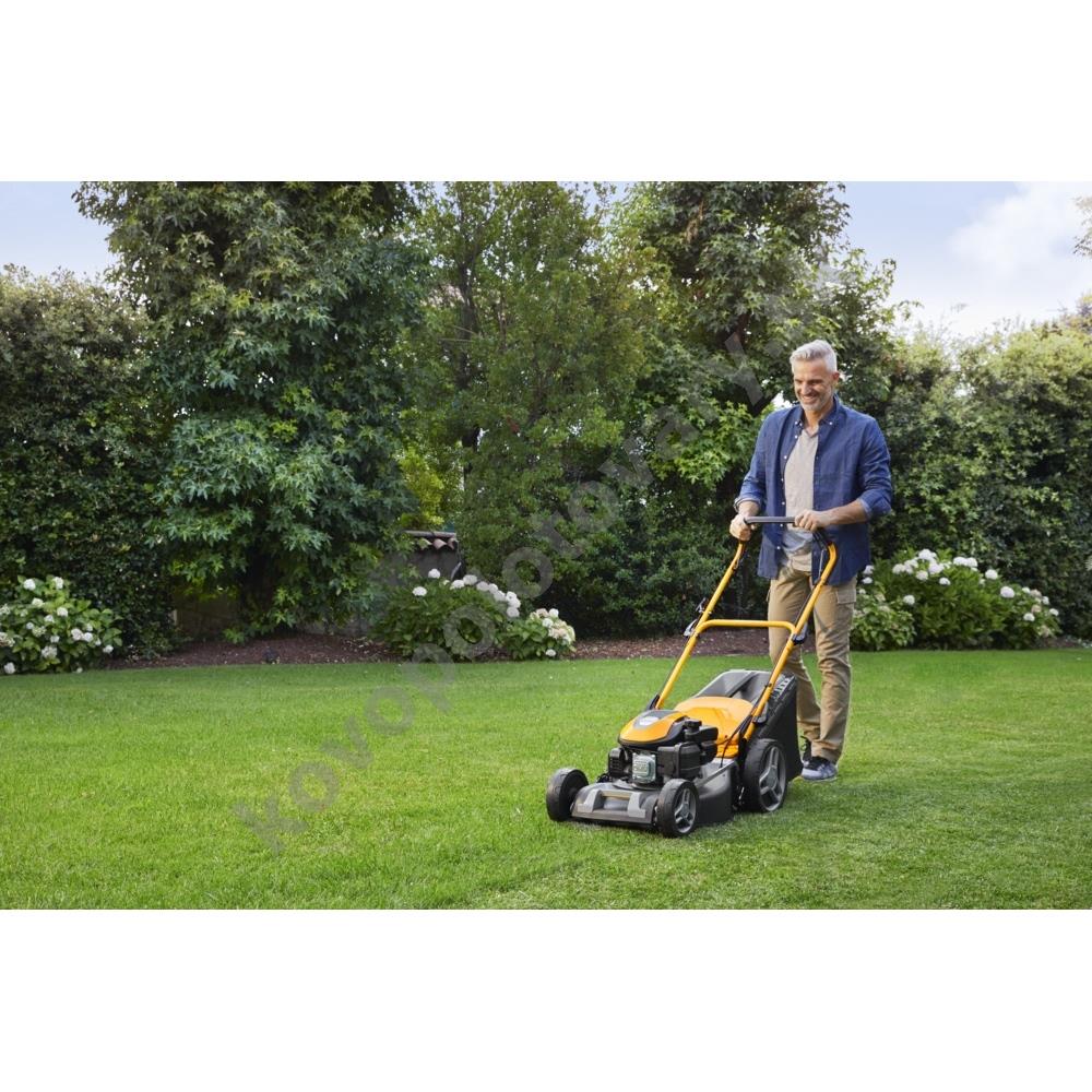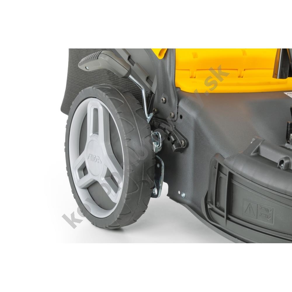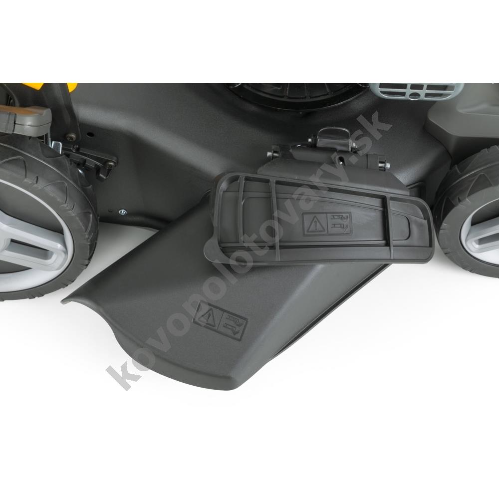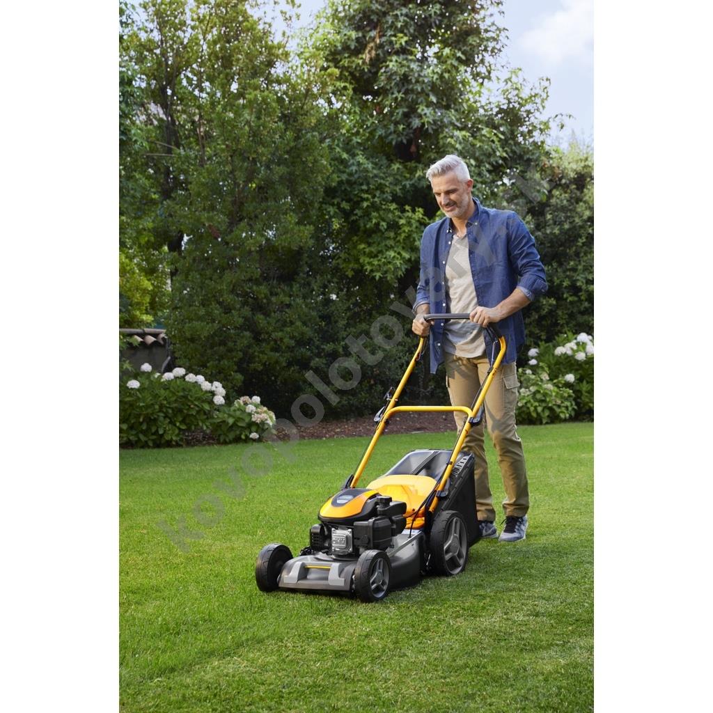 3, ktorý poskytuje stabilný výkon 2,2 kW. Vlastný pojazd s pohonom zadných kolies výrazne uľahčuje prácu vo svahovitom teréne alebo pri kosení rozľahlých plôch, pričom konštantná rýchlosť 3,7 km/h je optimalizovaná pre pohodlnú chôdzu.