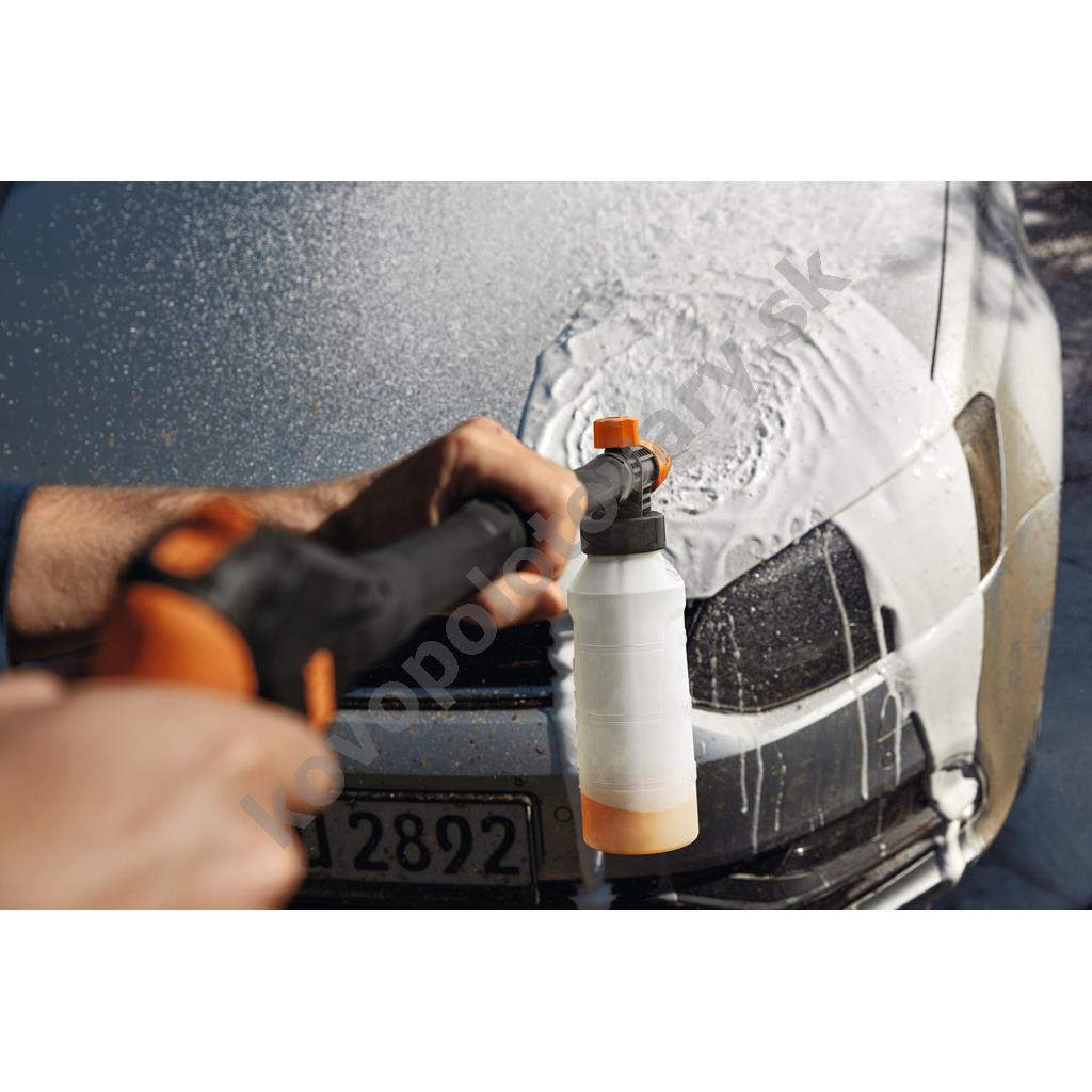 Tryska s nádobkou na aplikáciu peny s nastaviteľným uhlom postreku na použitie s vysokotlakovými čističmi STIHL. Dávkovací systém na čistiaci prostriedok s veľkým plniacim otvorom. Táto tryska je vhodná najmä na čistenie vozidiel.