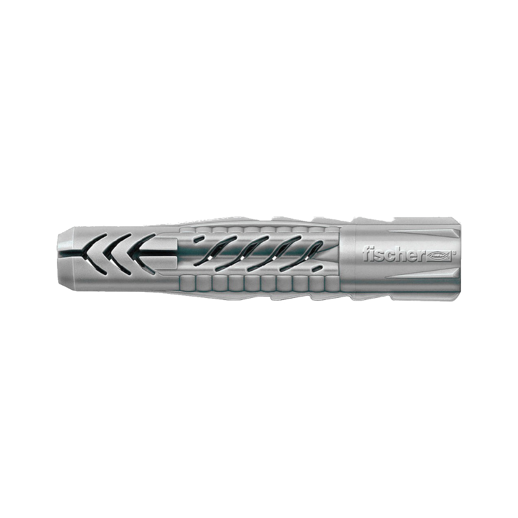 FISCHER UX 5 x 30 mm Hmoždinka bez goliera pre použitie s skrutkami do dreva a drevotriesky v rozmedzí od 4 do 12 mm. V plných stavebných materiáloch sa rozoprie, v dutinách sa spoľahlivo zauzlí. Pretáčaniu hmoždinky zabraňuje poistka proti pretáčaniu vo vyvŕtané diere.