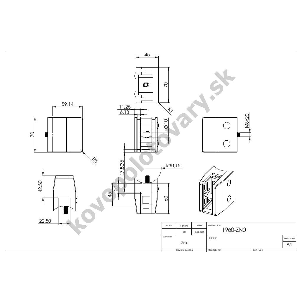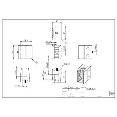 ZAMAK držiak skla - model 19 Dodávané v montážnom komplete t. j. spolu s prekrytkami, čapom a skrutkami. Určené pre vnútorné použitie napr. v systémoch stavebnicového nerezového zábradlia a schodísk.