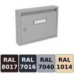 Hloubka schránky: 60; Jmenovka: Ano; Kamera: Ne; Komunikátor: Ne; Materiál: ocel; Montáž: na stěnu; Povrchová úprava: barveno; pozinkováno; Šířka schránky: 325; Venkovní použití: Ne; Vhoz zásilek: vpředu; Výběr zásilek: vpředu; Výrobce: DOLS; Výška schránky: 240; Zvonkové tlačítko: Ne; Barva schránky: Antracit RAL 7016; Béžová RAL 1014; Bílá RAL 9016; Hnědá RAL 8017; Šedá RAL 7040;